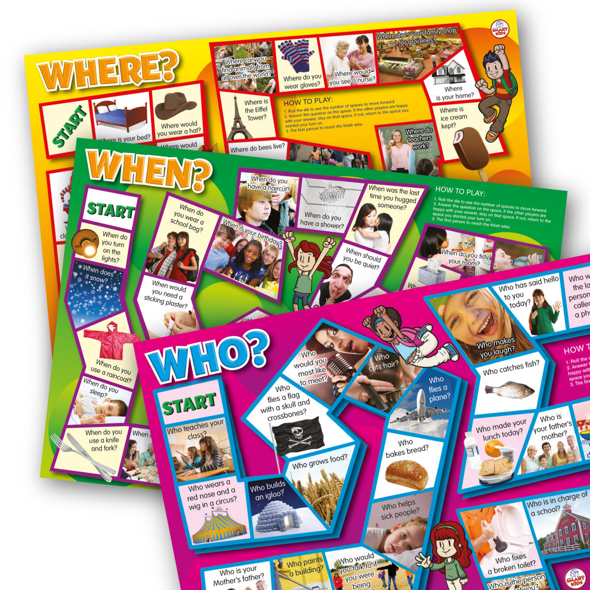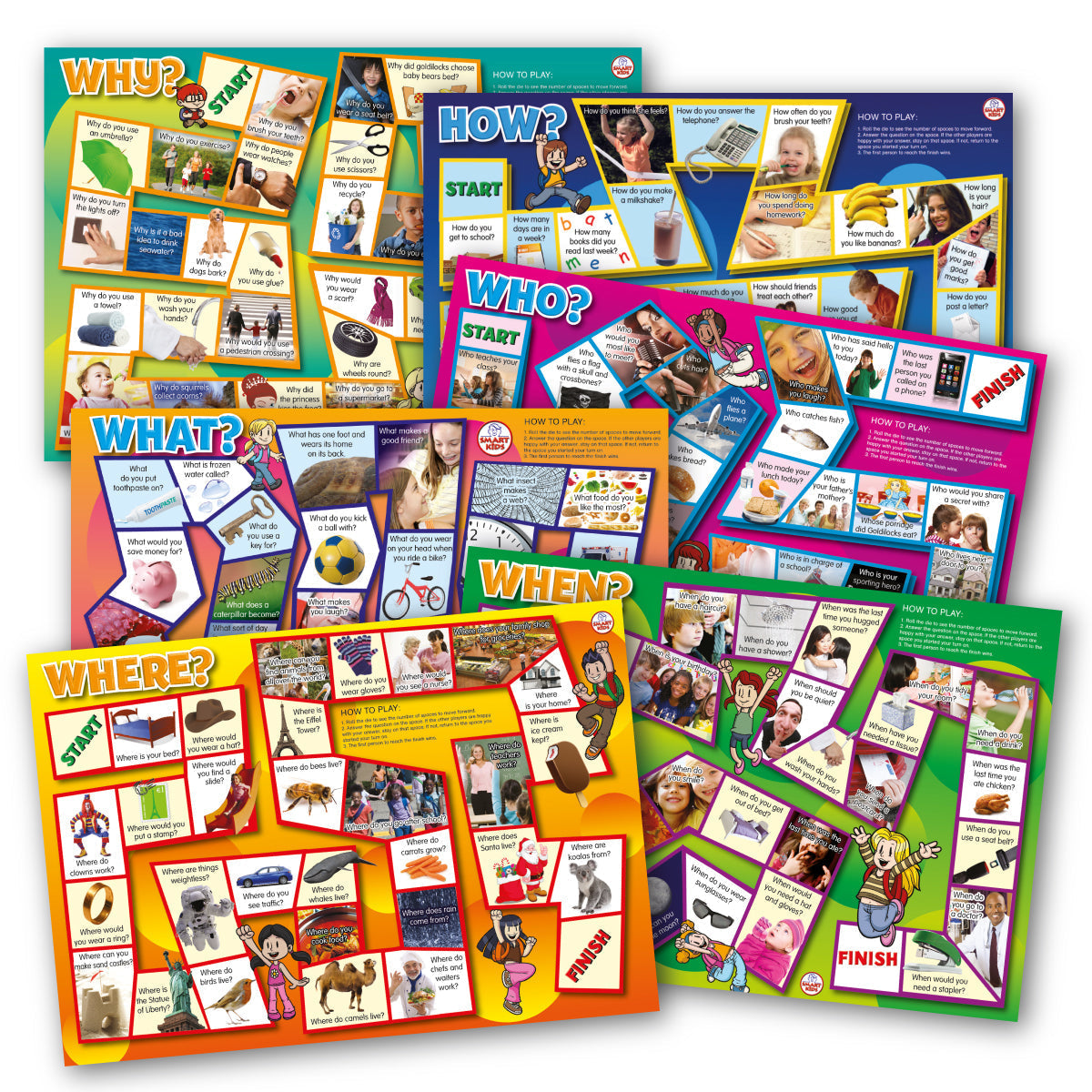 Develop knowledge of Who, What, Where, When, Why and How questions. Using these board games helps children build an understanding of how questions are used to obtain information while using critical thinking skills. Instructions are printed on the game boards.