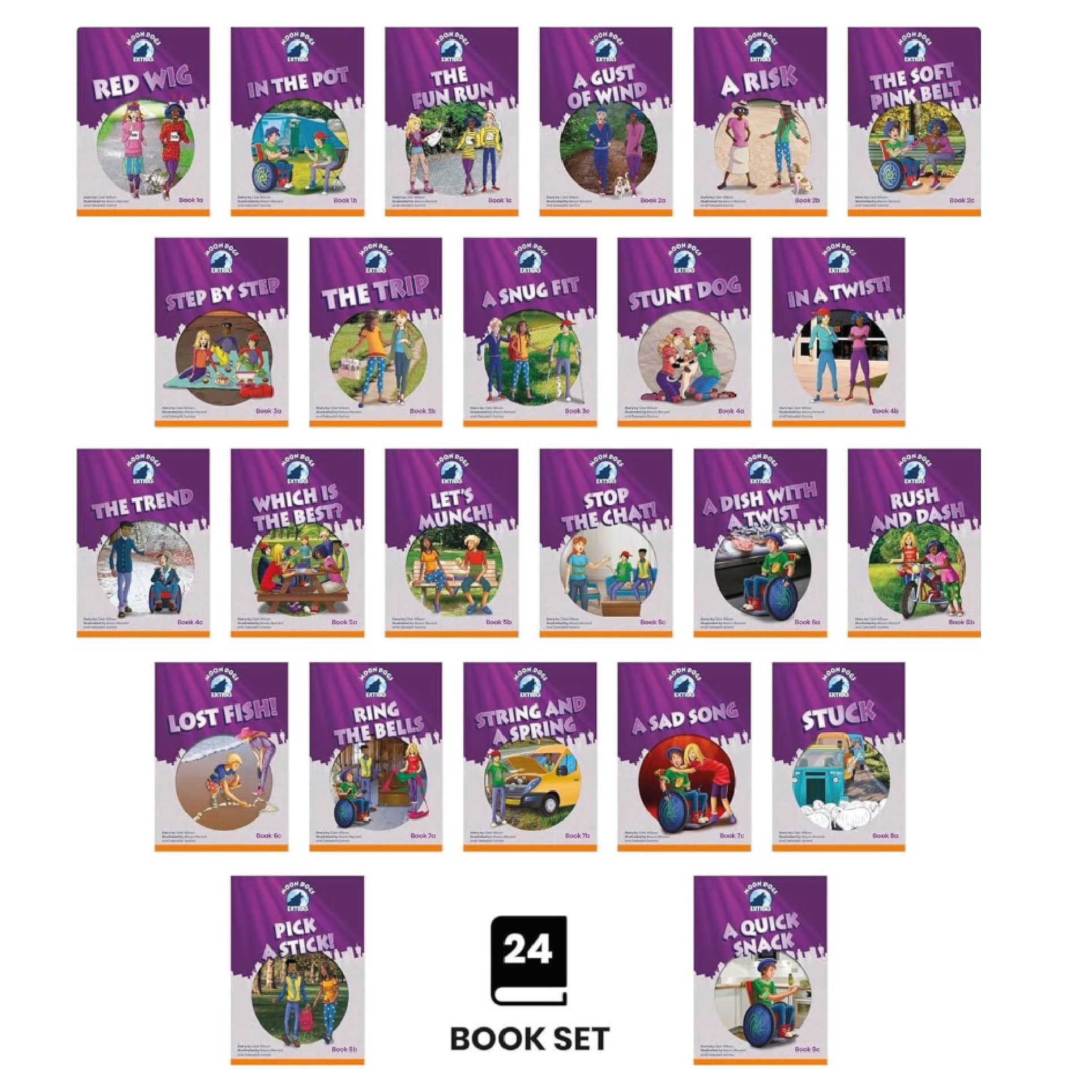 Extras Set 2 delivers 24 carefully sequenced books beginning at CVC level and progressing through adjacent consonants and consonant digraphs. Each level includes three titles, maintaining the structured, incremental learning approach characteristic of the core Moon Dogs Set 2 collection. Seamlessly integrates with Phonic Books Magic Belt and That Dog! series for comprehensive phonics instruction.