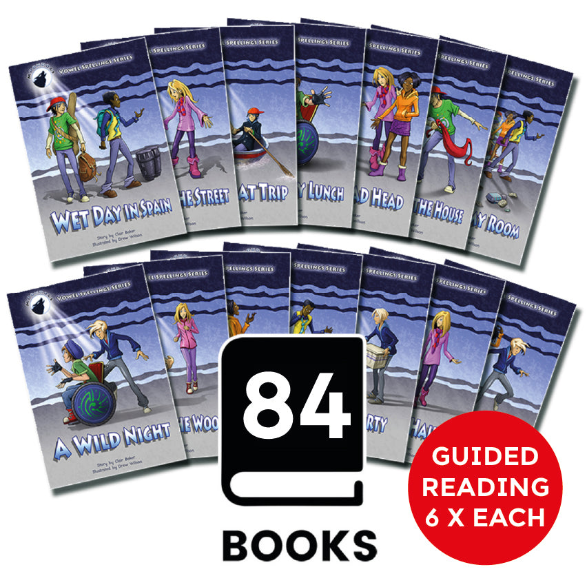 These decodable books for older, beginner readers are a contemporary series, continuing the adventure of the characters in the Moon Dogs band. Each story introduces two spellings of a vowel sound.