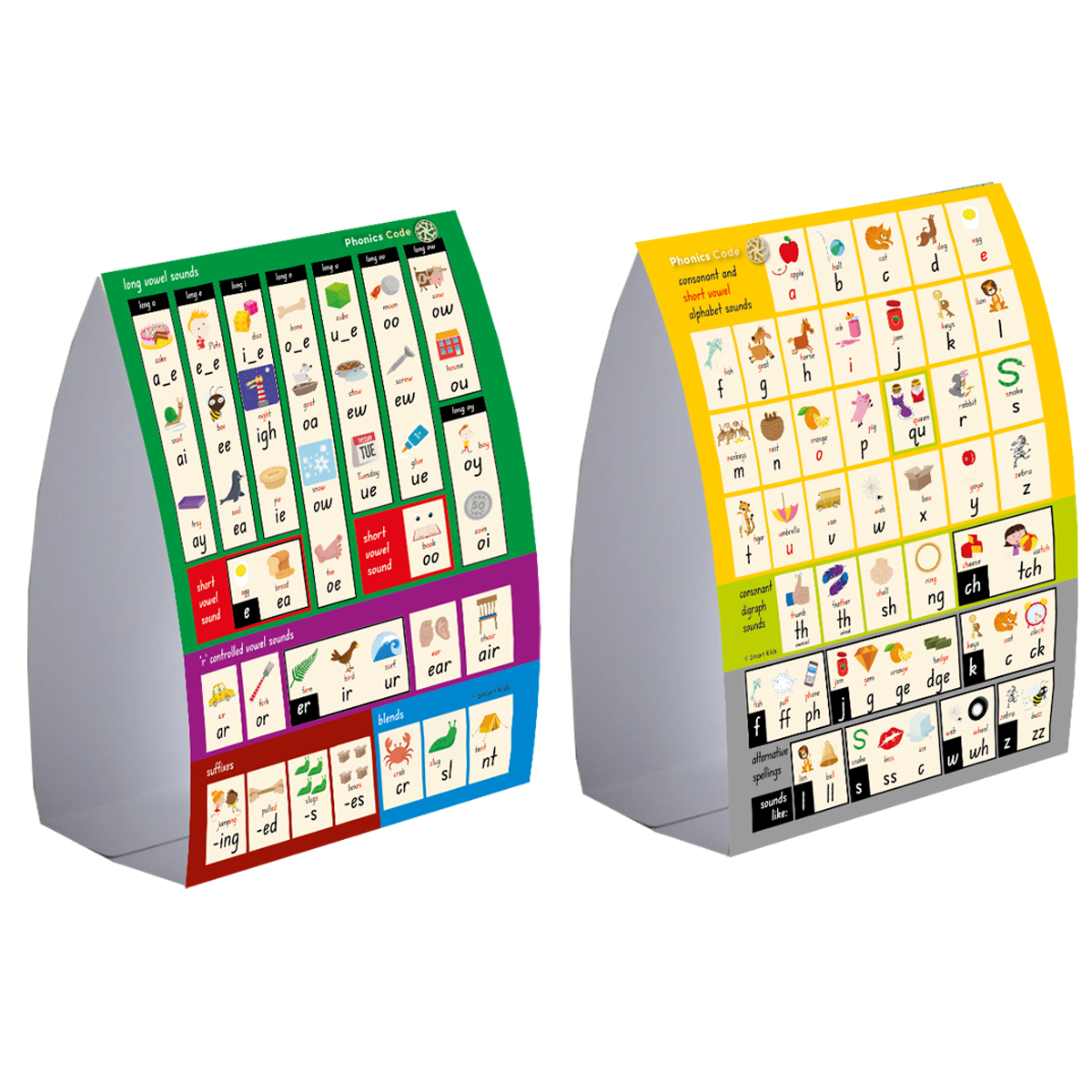 One side focuses on consonant sounds, giving children an at-a-glance guide to: