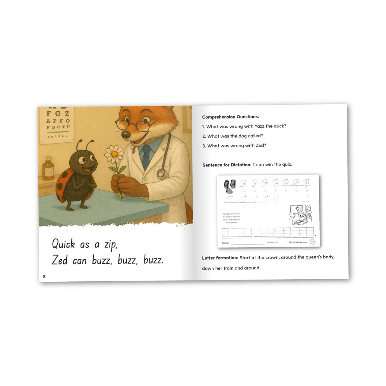 Phonics Code Book 36 introduces the spelling q-u for the sounds /k-w/.